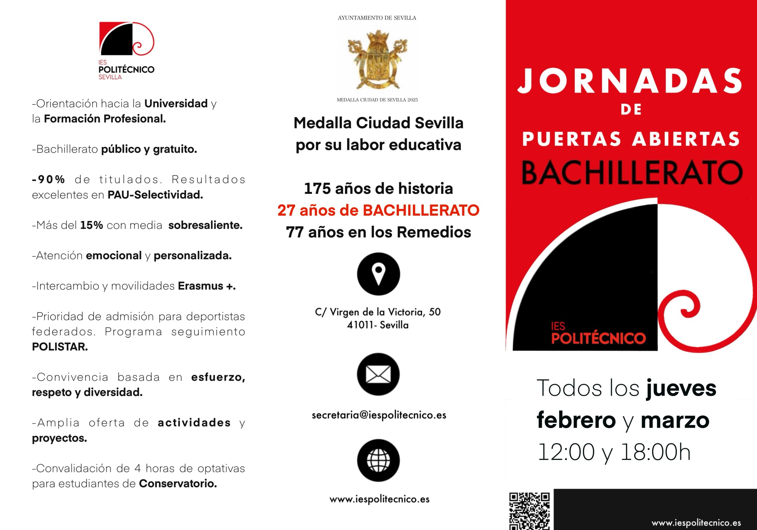 Con casi 175 años de historia desde la Escuela Industrial de Sevilla en 1851, 97 años desde que comenzó la FP reglada en 1929 con el Real Colegio Hispalense de FP, 76 años educando en el barrio de los Remedios de Sevilla y desde hace 27 impartiendo también Bachillerato, el I.E.S. Politécnico quiere ser tu centro público y gratuito de F.P. y de Bachillerato y, para ello, te ofrecemos una educación para tu vida personal, académica y social.
