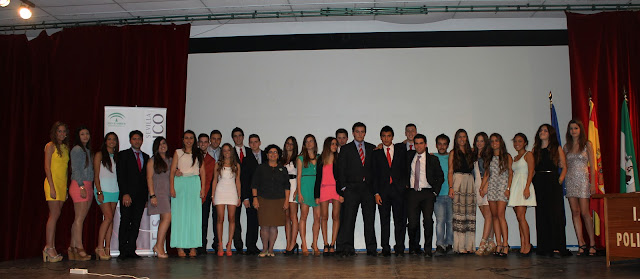 El pasado día seis celebramos la finalización del Bachillerato de nuestros alumnos de segundo. Dimos diplomas a los mejores expedientes de bachillerato y los seis grupos se fotografiaron con sus tutores. También se entregaron diversos premios y menciones y tuvimos hasta un pequeño concierto (que tuvo mucho éxito) interpretado por dos de nuestras alumnas.