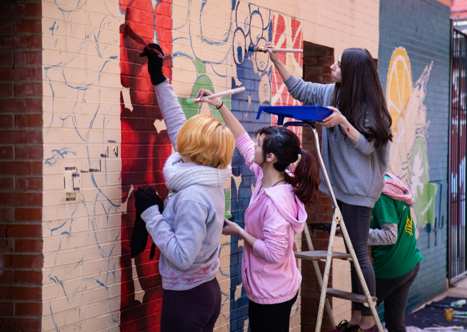 Estudiantes del 2º curso de Bachillerato de Artes del IES Politécnico de Sevilla pintan murales del mercado de abastos de Los Remedios en una iniciativa de la Fundación Tres Culturas con respaldo del Ayuntamiento de Sevilla.