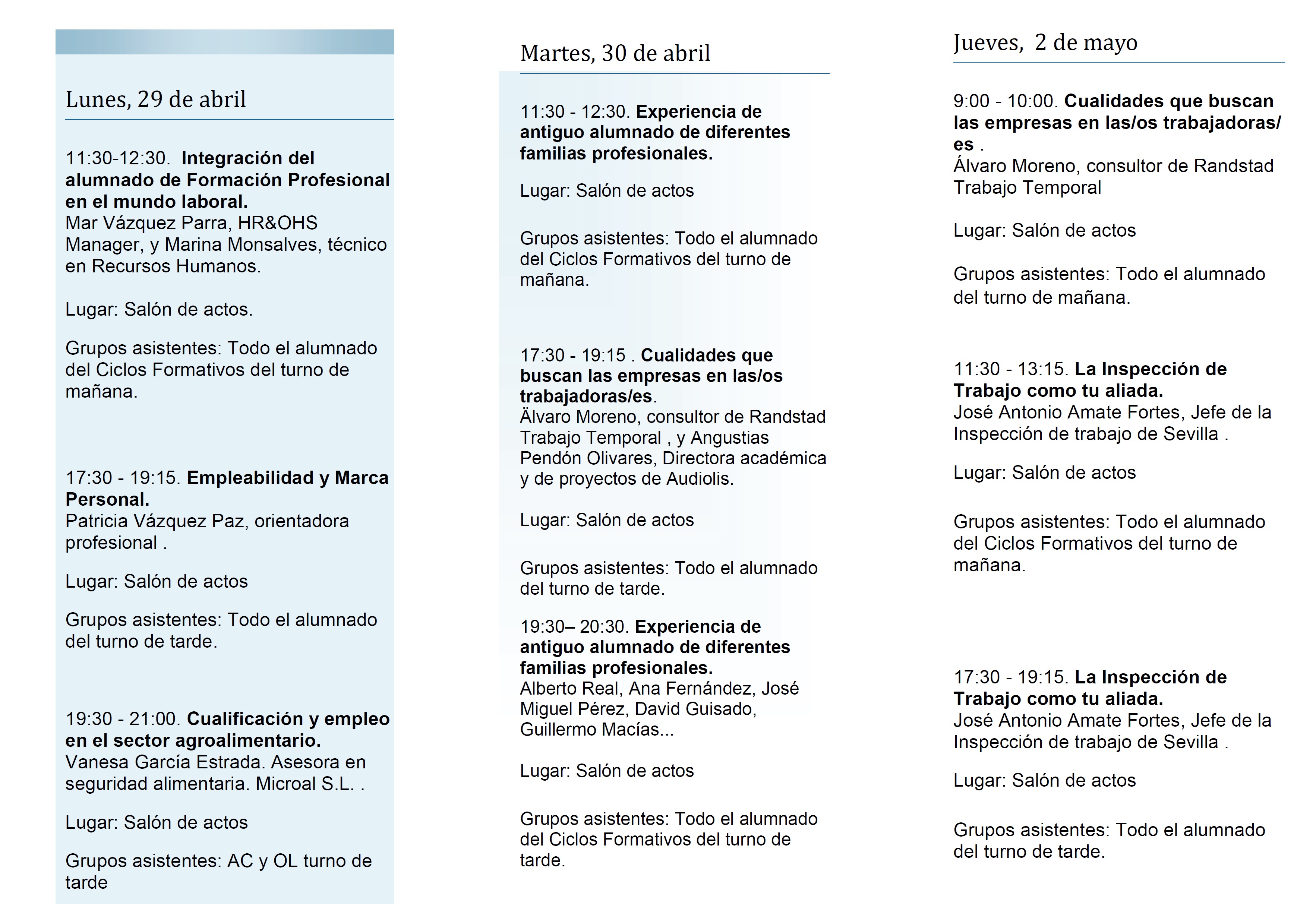 Entre las interesantes intervenciones se encuentran las del Inspector jefe de la Inspección de Trabajo y Seguridad Social de Sevilla, D. José Antonio Amate Fortes; Dña. Patricia Vázquez Paz, Orientadora laboral de amplia experiencia y experta en nuevos modelos de empleo y marca personal; distintos representantes de Empresas de trabajo temporal y de Recursos Humanos (Randstad, Audiolis, HR@OHS…), que hablaran a nuestro alumnado especialmente de qué actitudes y habilidades requieren las empresas de los trabajadores/as; empresas colaboradoras en la FCT de nuestro alumnado, como Microal SL, que contribuirán entre otras cosas a que el alumnado tenga una visión más cercana del entorno laboral y un conocimiento más abierto y concreto de profesiones que podrán desempeñar en el futuro; y antiguas/os alumnas/os, que contarán a quienes aún están en proceso de formación en nuestro centro su experiencia académica y su trayectoria laboral, les informarán sobre la realidad del mundo del trabajo y les aconsejarán sobre lo que las empresas valoran.