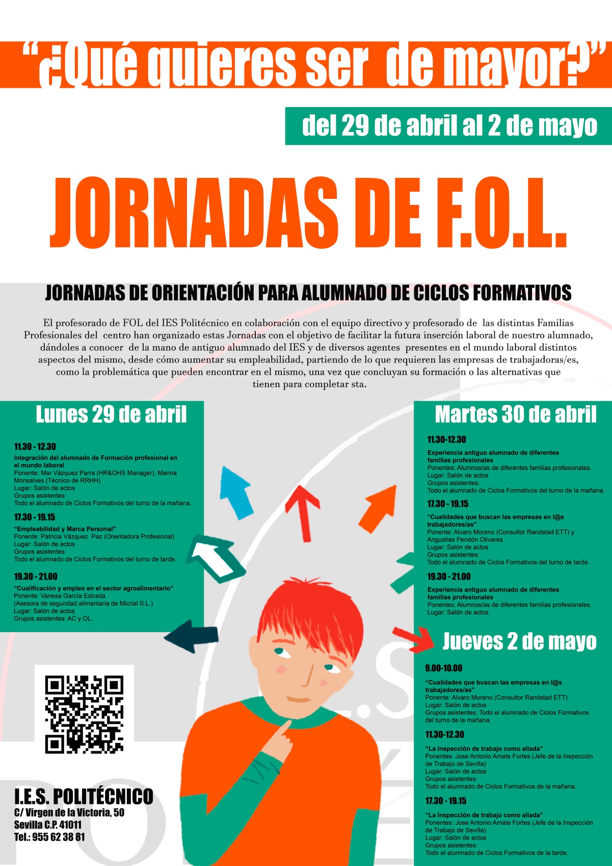 Durante los días 29 y 30 de abril y 2 de mayo se celebrarán en el IES Politécnico las Jornadas de Orientación Profesional dirigidas al alumnado de Formación Profesional y organizadas por el Departamento de FOL y el Área de FP del IES Politécnico para potenciar el conocimiento del mundo laboral, la orientación y la empleabilidad de nuestro alumnado.