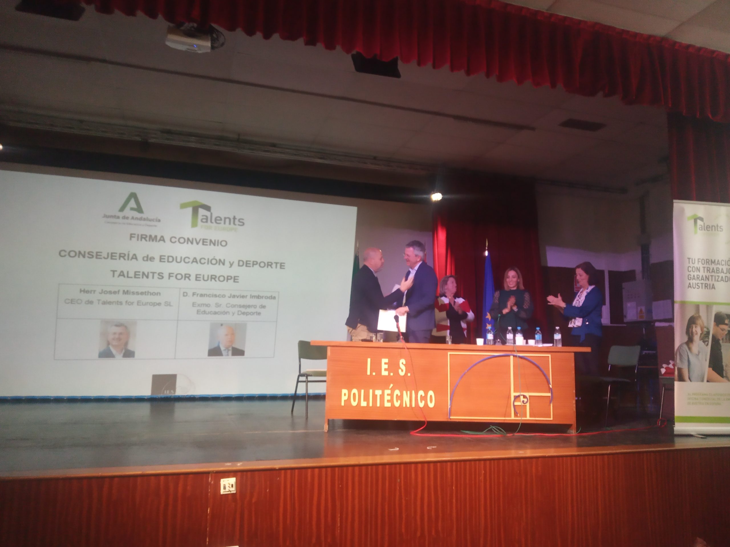 Durante el pasado 19 de febrero se celebró en nuestro centro la firma del acuerdo de un Convenio de colaboración entre la Consejería de Educación y Deporte de la Junta de Andalucía y Talents for Europe Missethon S.L. para la convocatoria de ayudas económicas de esta empresa destinadas al alumnado de FP contando con la presencia del Exmo. Sr. Consejero de Educación D. Francisco Javier Imbroda y el CEO de Talents for Europe SL, Herr Josef Missethon, acompañados de la Secretaria General de Educación y Formación Profesional de la Consejería de Educación y Deporte de la J.A., Dña. Olaia Abadía y la Directora del IES Politécnico, Dña. Isabel Cuéllar.