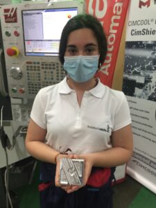 También ha participado en la especialidad de CNC (Control numérico por Computadora) para torneado y fresado, nuestra alumna del curso pasado y ya Técnica en Mecanizado  Nerea Rodríguez Sánchez bajo la tutela de los profesores Mario Martínez Abad y José Antonio Mejías Sanguino del Dtpo. de Fabricación Mecánica. No ha podido estar en el nivel clasificatorio alcanzado por David, pero sí ha logrado participar y desarrollar un alto nivel durante los días de la competición, que a buen seguro han supuesto una mejora en sus conocimientos y toda una experiencia enriquecedora.