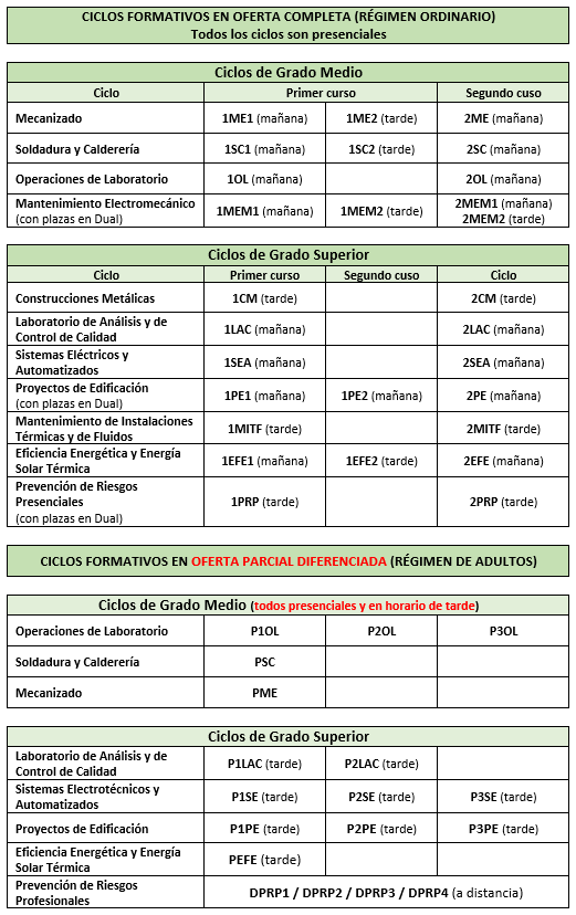 En la siguiente tabla se recogen los grupos de Formación Profesional de nuestro centro y el turno horario al que corresponden.