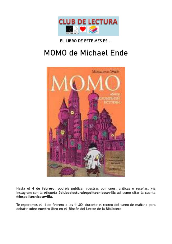Nueva propuesta del #Clubdelecturapolitecnico del IES Politécnico de Sevilla para estas vacaciones. Se trata de Momo de Michael Ender. Todo un clásico de la literatura juvenil e imprescindible en la biblioteca de cualquier lector amante de la fantasía y la imaginación. Una recomendación muy oportuna para estas vacaciones. Os esperamos en nuestra próxima reunión el […]