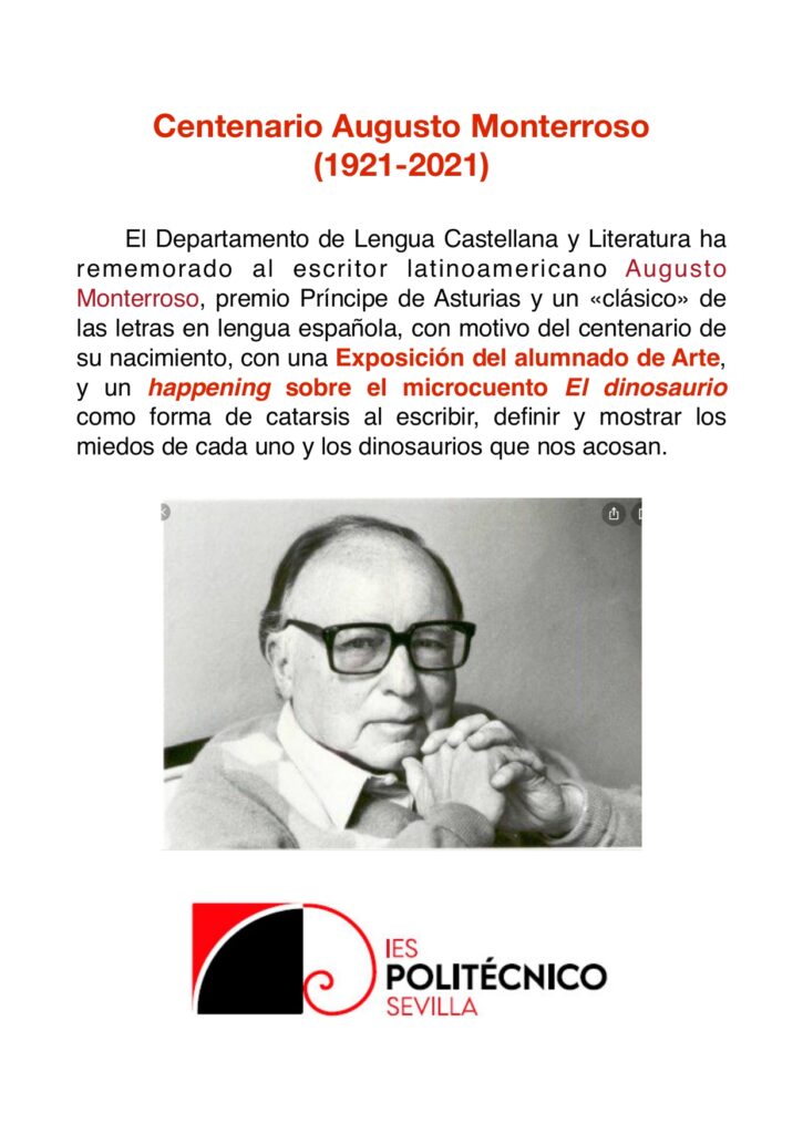 El Departamento de Lengua Castellana y Literatura de nuestro centro conmemora el centenario del nacimiento del escritor sudamericano Augusto Monterroso nacionalizado guatemalteco y exiliado en México. Es un clásico de la Literatura Hispanoamericana y Premio Príncipe de Asturias. Es por ello que nuestro centro quiere celebrar esta conmemoración con una Gran Exposición del alumnado de […]
