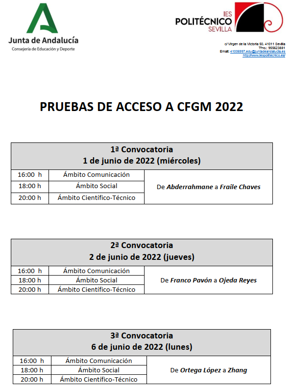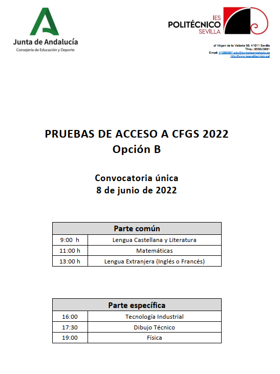 El calendario de las pruebas de acceso a Ciclos Formativos de Grado Medio (CFGM) y a Ciclos Formativos de Grado Superior (CFGS) por la Opción B en este centro y la adscripción de los solicitantes admitidos en ellas se detalla a continuación. Recordamos que actualmente se celebra anualmente una única convocatoria y en junio. Es decir, ya no hay convocatoria en septiembre.