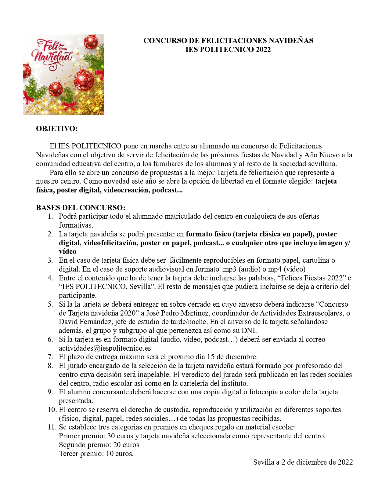 El IES POLITECNICO pone en marcha entre su alumnado un concurso de Felicitaciones Navideñas con el objetivo de servir de felicitación de las próximas fiestas de Navidad y Año Nuevo a la comunidad educativa del centro, a los familiares de los alumnos y al resto de la sociedad sevillana.