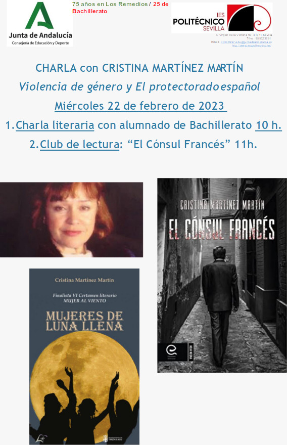 • El próximo miércoles 22 de febrero contaremos con la presencia de la escritora Cristina Martínez Martín. A las 10 de la mañana tendrá un encuentro literario con el alumnado de bachillerato sobre “Violencia de género y El protectorado español” y a continuación a las 11h se reunirá con el Club de Lectura para comentar su novela “El cónsul de francés” que este la obra escogida para este mes disponible en la biblioteca del centro, por lo que se trata de una gran oportunidad de contrastar opiniones con la propia autora. Para el 27 de marzo repetiremos experiencia con la polifacética Greta García, nuevamente con un encuentro previo a las 10:00 y a las 11:00 con el Club de Lectura para analizar su libro de reciente publicación “Sólo quería bailar” y que estará disponible en la biblioteca del instituto a partir del 1 de marzo. Todos estos actos organizados, principalmente, por el profesorado del Área socio-lingüística y de actividades.