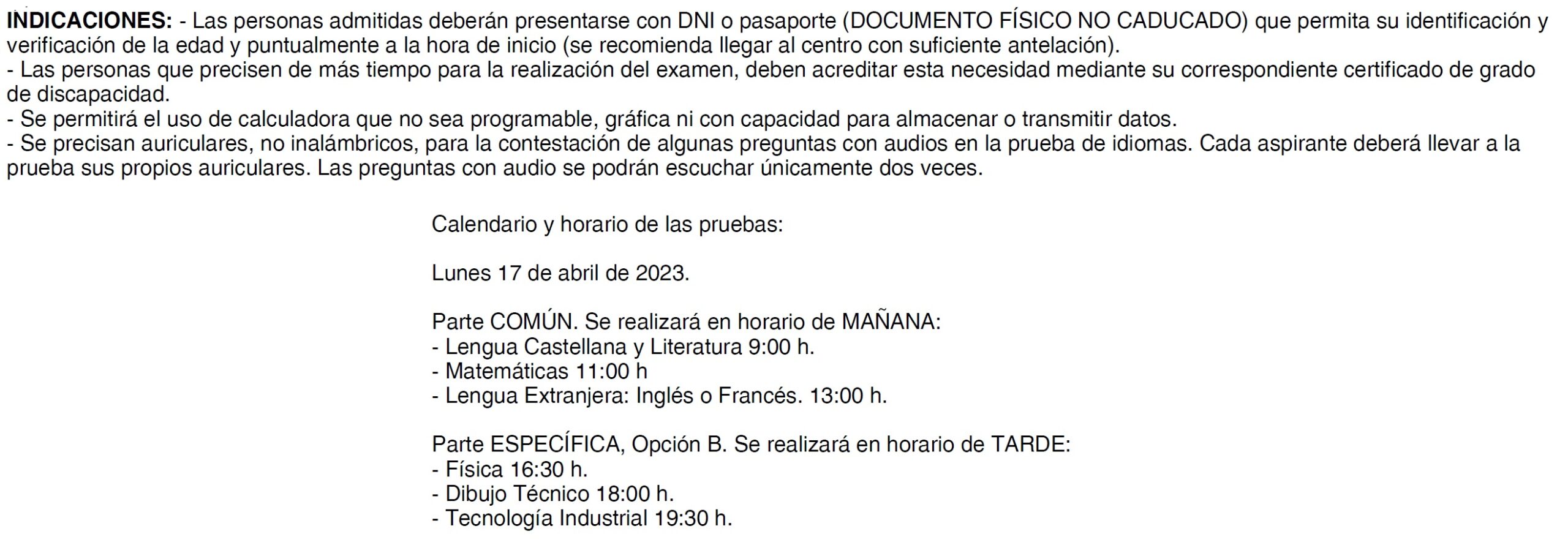 En la siguiente imagen se recoge el calendario de las Pruebas de Acceso a CFGS que se celebrarán ÚNICAMENTE el LUNES 17 de ABRIL para los solicitantes admitidos en ellas en nuestro centro. La imagen recoge también las indicaciones o instrucciones para los inscritos. Es importante: