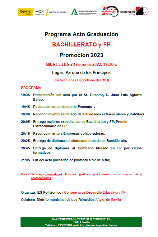 ¡Llegó el momento! Celebramos, con la colaboración del Distrito de Los Remedios del Ayto. de Sevilla, este próximo miércoles 28 de junio a las 19:30h (rogamos, ¡PUNTUALIDAD!) en la pista deportiva del Parque de los Príncipes el ansiado y esperado acto de graduación final de curso y al que está invitado todo el alumnado y familias del centro, pudiendo acudir acompañado de un máximo de hasta 4-5 personas todo aquel que se gradúe.