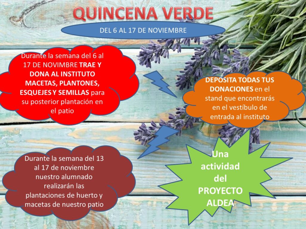 Entre el 6 y 17 de noviembre nuestro instituto celebrará la QUINCENA VERDE con la idea de colaborar en la plantación de hortalizas y verduras en nuestro HUERTO ESCOLAR y plantas en nuestro jardín vertical así como las macetas del patio. Para ello, pedimos vuestra colaboración: del 6 al 10 de noviembre, os pedimos que […]