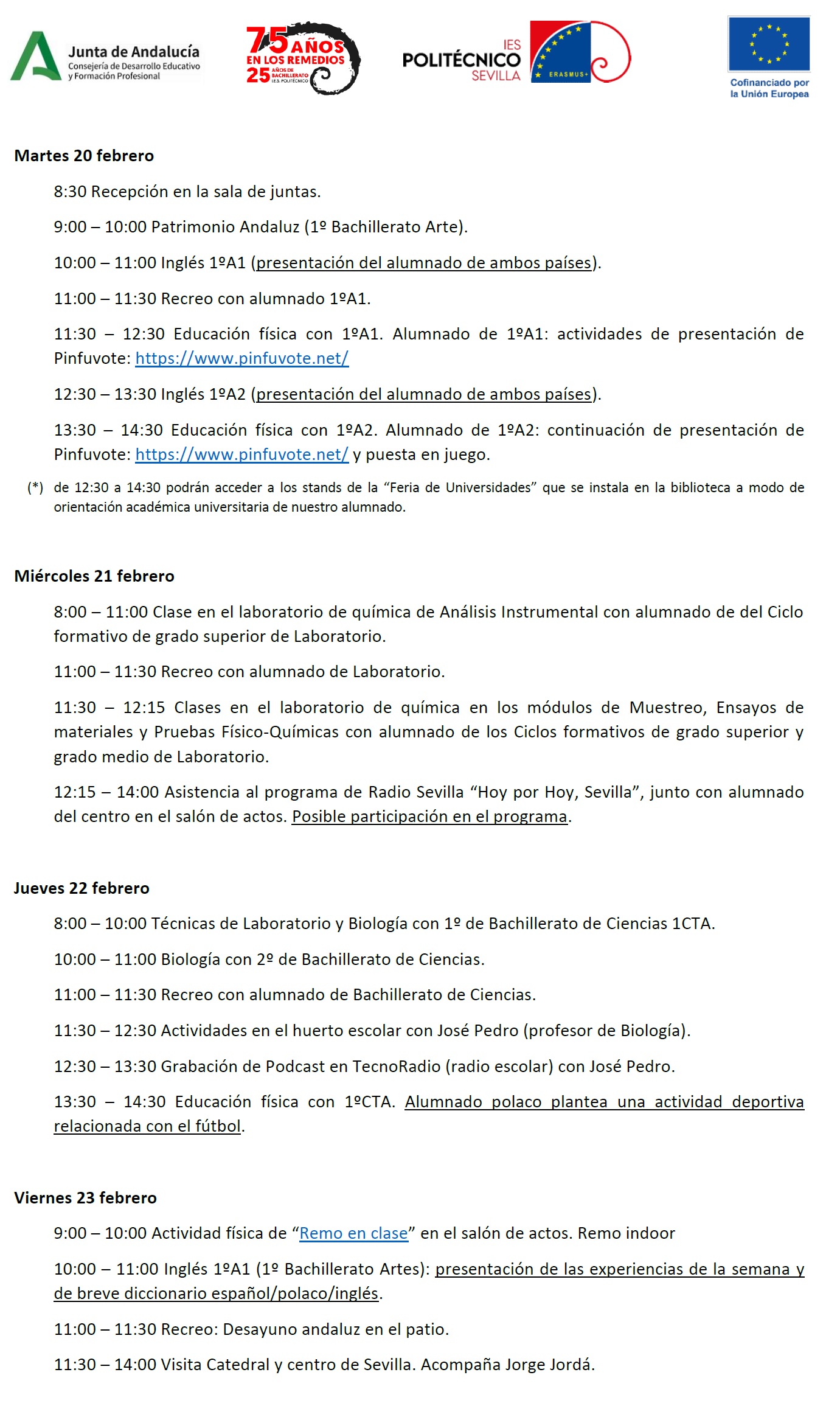 15 estudiantes polacos del centro PSLO Pierwsze Społeczne Liceum Ogólnokształcące (Primera Escuela Secundaria Social) de la ciudad de Gdynia acompañados de varias profesoras han sido acogidos durante la semana del martes 20 al viernes 23 en nuestro centro, compartiendo clases e intercambiando muy diferentes y enriquecedoras experiencias con el alumnado de 1º de bachillerato, principalmente, llegando a realizar actividades conjuntas como las de “Remo en clase”, visita a la catedral, desayuno andaluz, conocer el pinfutvote (modalidad deportiva nacida en Triana, etc). Pincha en la imagen para ver el programa.