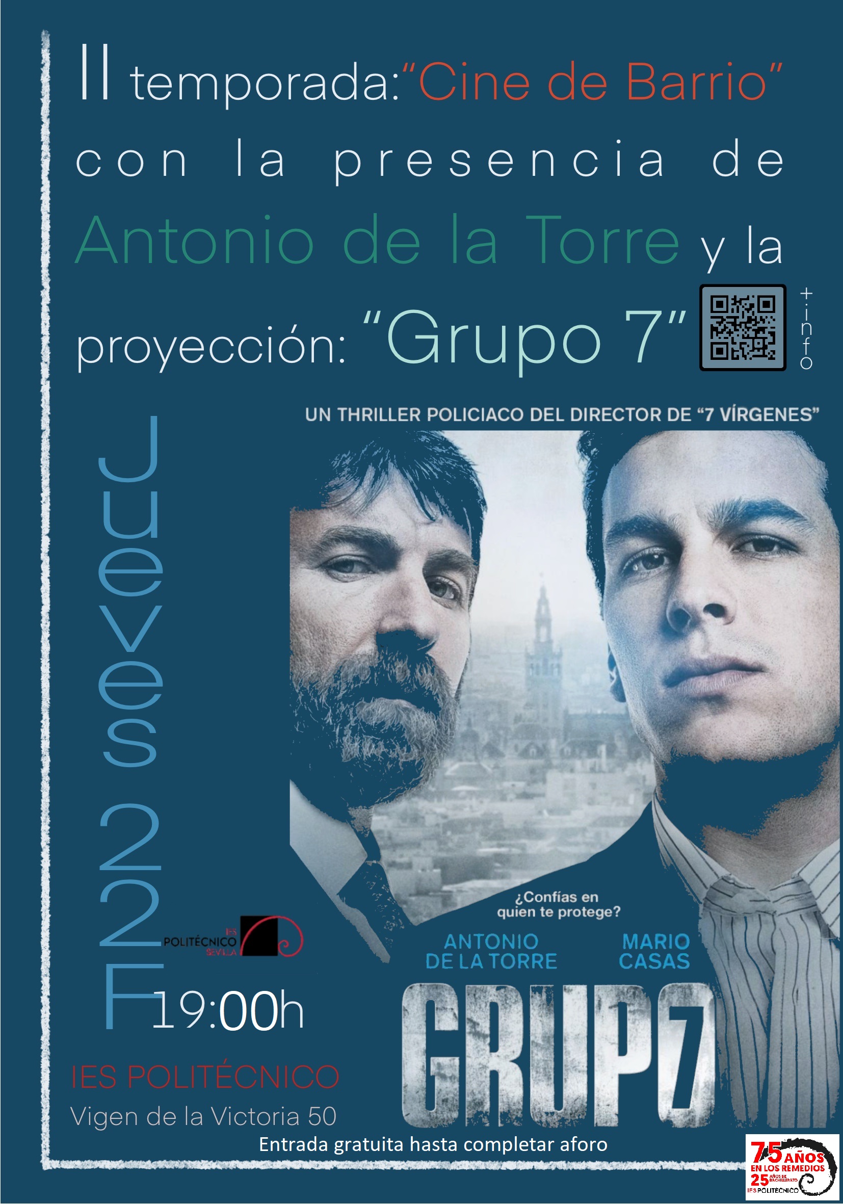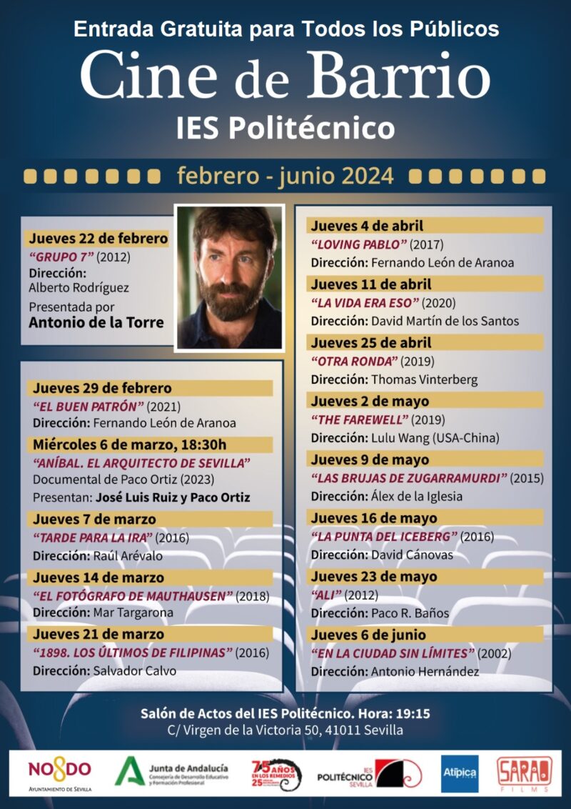 La proyección de Grupo 7 inaugura la II temporada de “Cine de barrio”, con la colaboración del distrito de Los Remedios, mediante la cual proyectaremos una película cada jueves lectivo a las 19:15h hasta el 6 de junio, además del miércoles 6 de marzo, en el que a las 18:30, tras una charla sobre el Urbanismo en el barrio de Los Remedios impartida por el historiador José Luis Ruiz Ortega, proyectaremos en exclusiva el exitoso documental Aníbal. El arquitecto de Sevilladel productor y director Paco Ortiz, por cortesía de nuestra vecina productora SARAO Films.