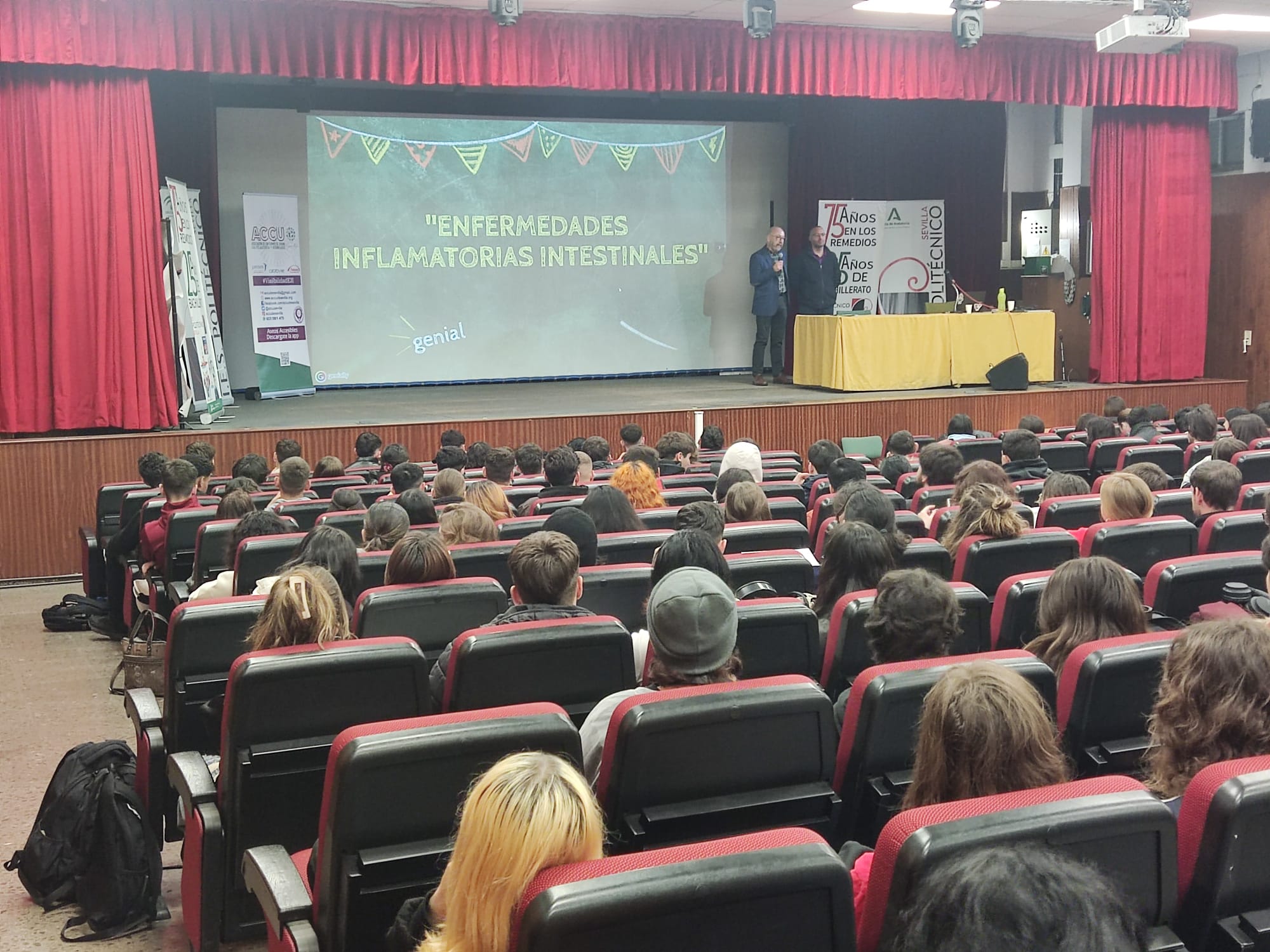 Este miércoles 21 febrero, a las 10:00 de la mañana y en horario de tarde a las 16:45h hemos tenido dos charlas sobre Enfermedades Gastrointestinales y su problemática en adolescentes y jóvenes de la mano de la asociación ACCU Sevilla, de la mano de su presidente José Luis Rodríguez y de Antonio Aguilar alumno del IES Politécnico y paciente de enfermedad gastrointestinal inflamatoria, con la que se ha visibilizado esta probelmática tabú en jó