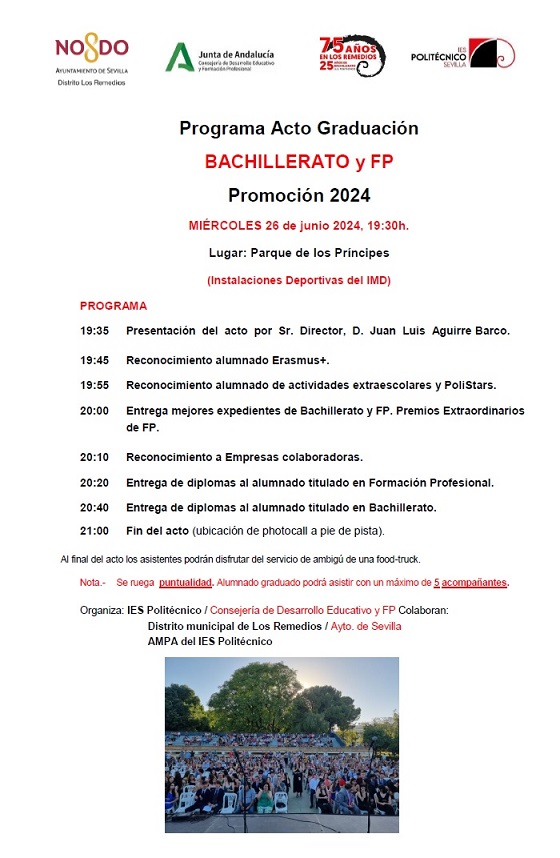Un curso más la celebramos, con la colaboración de la AMPA de nuestro centro y del Distrito de Los Remedios del Ayto. de Sevilla este ansiado y esperado acto en la pista deportiva del Parque de los Príncipes, lo que nos permite invitar a todo el alumnado y familias del centro, pudiendo acudir acompañado de un máximo de hasta 4-5 personas todo aquel que se gradúe.