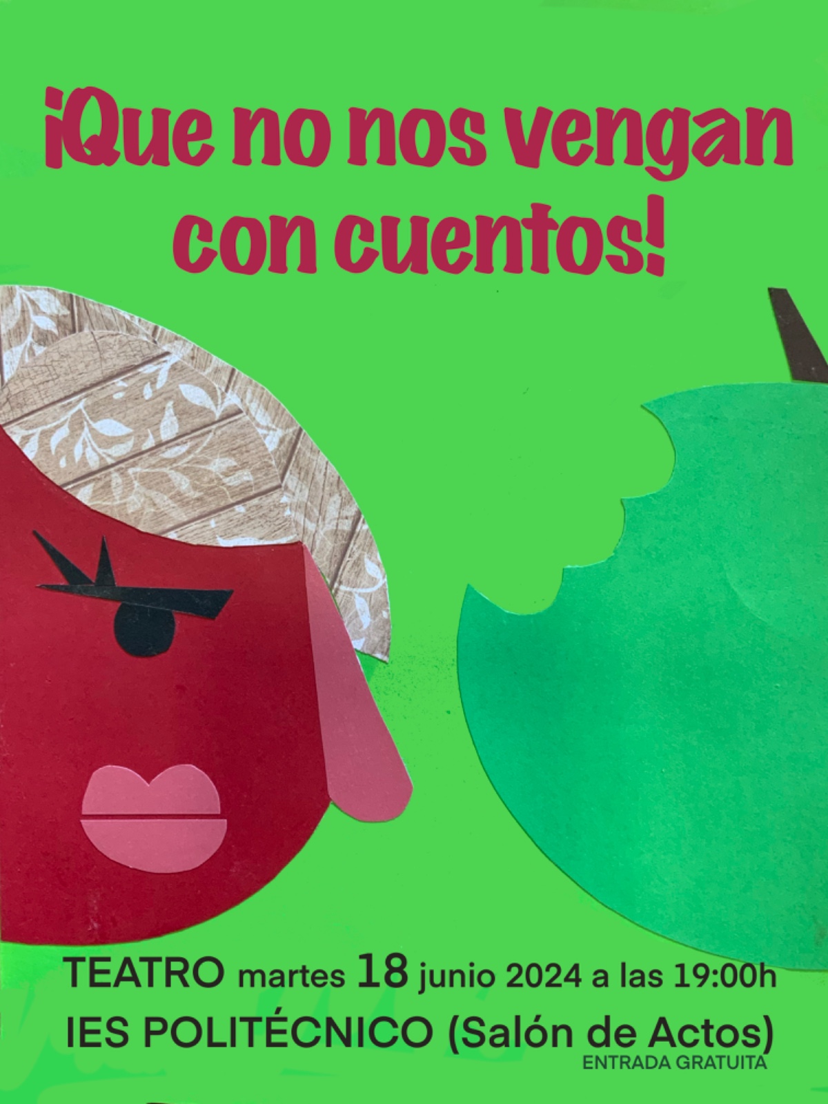 Además, el IES Politécnico se ha estrenado en el Certamen anual de teatro que convoca el IES Martínez Montañés que tuvo lugar el pasado lunes día 3 de junio. Coordinado por la profesora de Dibujo, Lola Estacio, presentamos una obra de teatro escrita e interpretada por nuestros/as alumnos/as de 1º de bachillerato y el fallo del jurado lo conoceremos en la gala del próximo lunes día 10 de junio a las 18:30h. Nuestra obra, QUE NO NOS VENGAN CON CUENTOS, es una adaptación de 6 cuentos tradicionales interpretada bajo una perspectiva feminista. En todos sus diálogos vemos actualizadas y reinterpretadas muchas de las escenas que aparecen en cada relato popular pero con guiños feministas y bajo una feroz crítica al lenguaje machista original. Esta divertida obra, apta para todos los públicos, será representada nuevamente en el salón de actos de nuestro centro este próximo martes 18 de junio a las 19h con entrada libre hasta completar aforo.