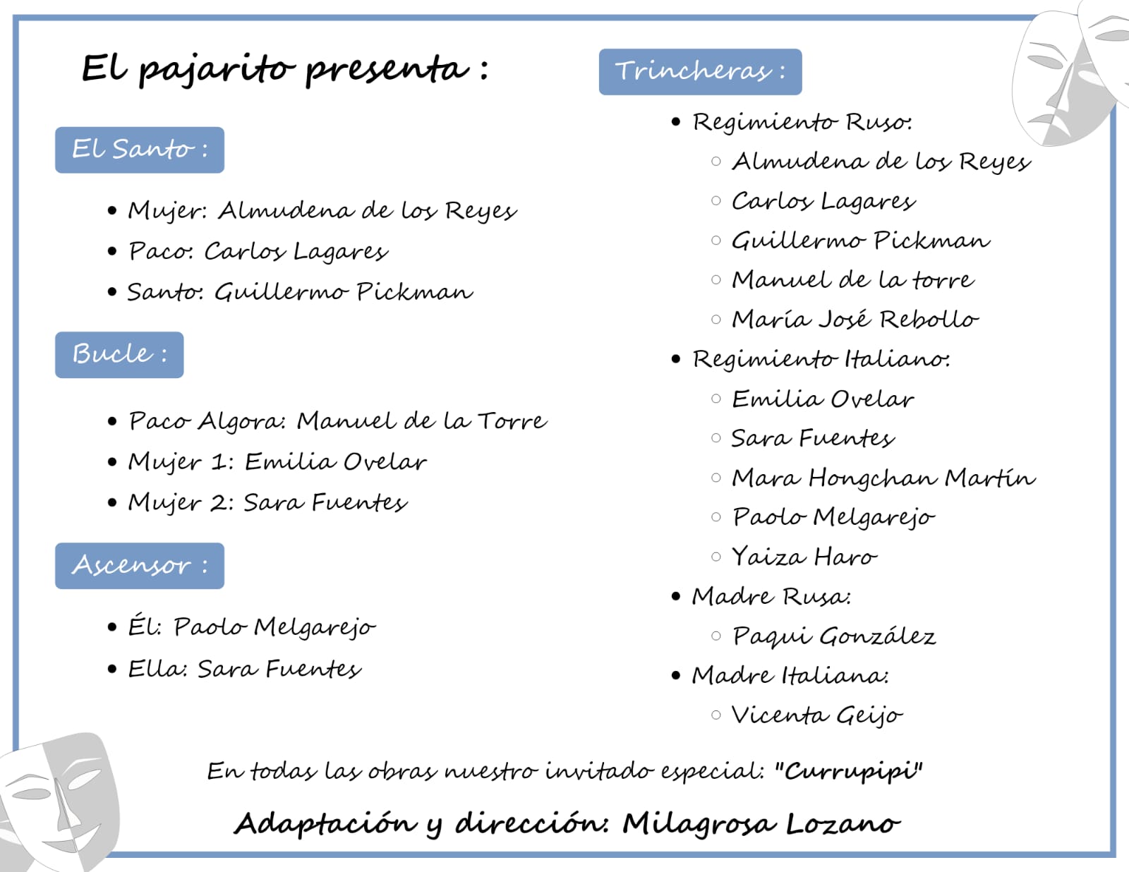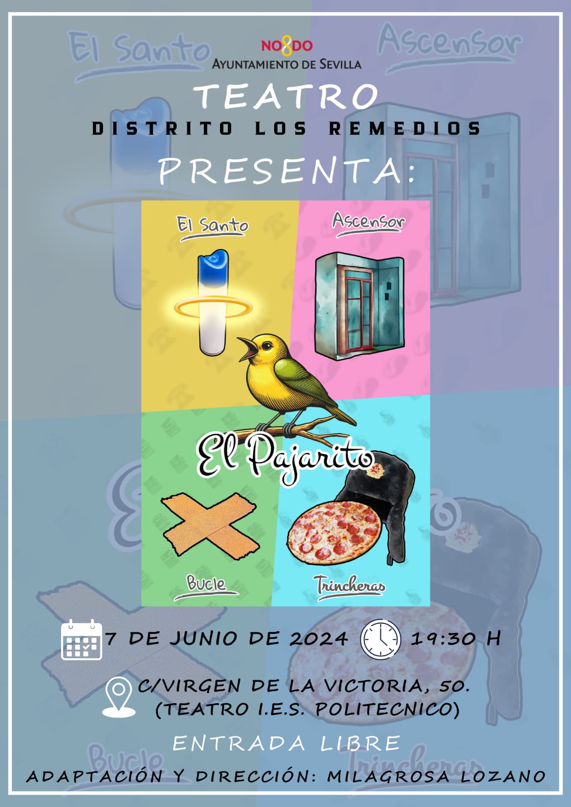 Este próximo viernes 7 de junio a las 19:30h el taller de teatro del Distrito de Los Remedios que se desarrolla en nuestro centro durante todo el curso bajo la dirección de Mila Lozano, representará cuatro estupendas obras, con la participación conjunta de vecinos y vecinas del barrio y alumnado de bachillerato del IES Politécnico. La entrada será libre para todos lo públicos hasta completar aforo.