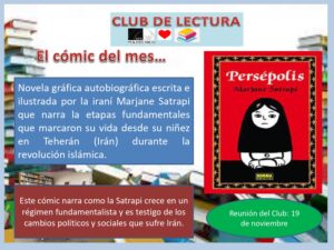 Como primero lectura del curso proponemos la novela gráfica “Persépolis” Se trata de una novela gráfica autobiográfica escrita e ilustrada por la iraní Marjane Satrapi que narra la etapas fundamentales que marcaron su vida desde su niñez en Teherán (Irán) durante la revolución islámica.
