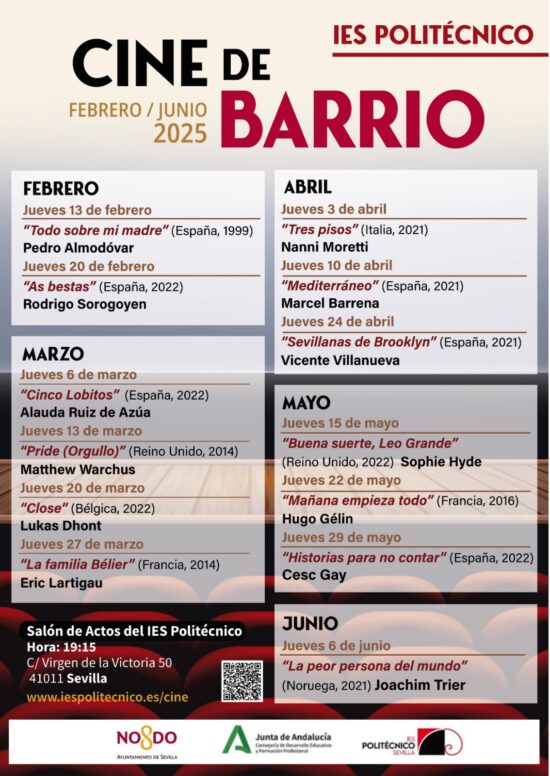 Estrenamos el 13 de febrero 2025 la III temporada de “Cine de Barrio” en colaboración con el distrito de Los Remedios, con un Homenaje a la actriz Marisa Paredes y la proyección el día 20 de “As Bestascomo principales reclamos. Recuerda que la entrada es libre y gratuita para todos los públicos todos los jueves lectivos a las 19:15 hasta principios de junio.
