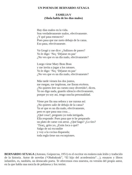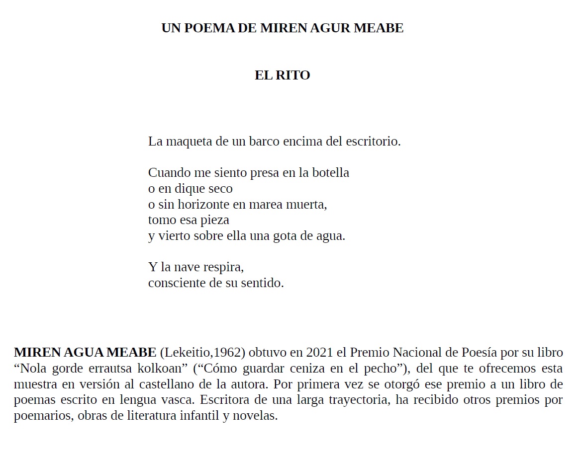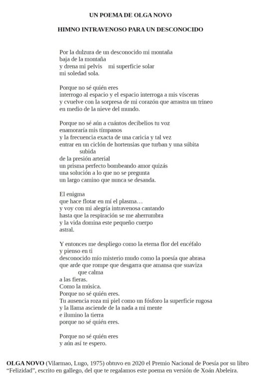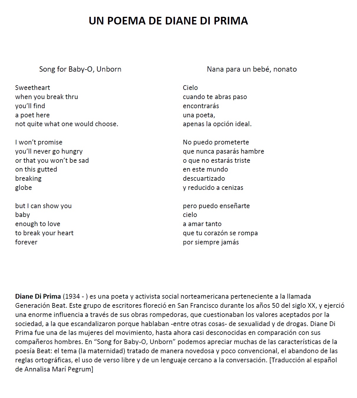 Última y prolífica muestra de nuestra poesía colgada. Esta vez, una mezcolanza integradora y diversa con poetas vascos (Bernardo Atxaga y Miren Agur Meabe), gallegos (Uxío Novoneyra, Olga Novo y Luis Pimentel), neoyorkino (Diane di Prima), londinense del sXVII (John Donne), nicaragüense (Gioconda Belli) y hasta un videopoema de una joven de Murcia Abbey C. Díaz que puedes escuchar aquí.