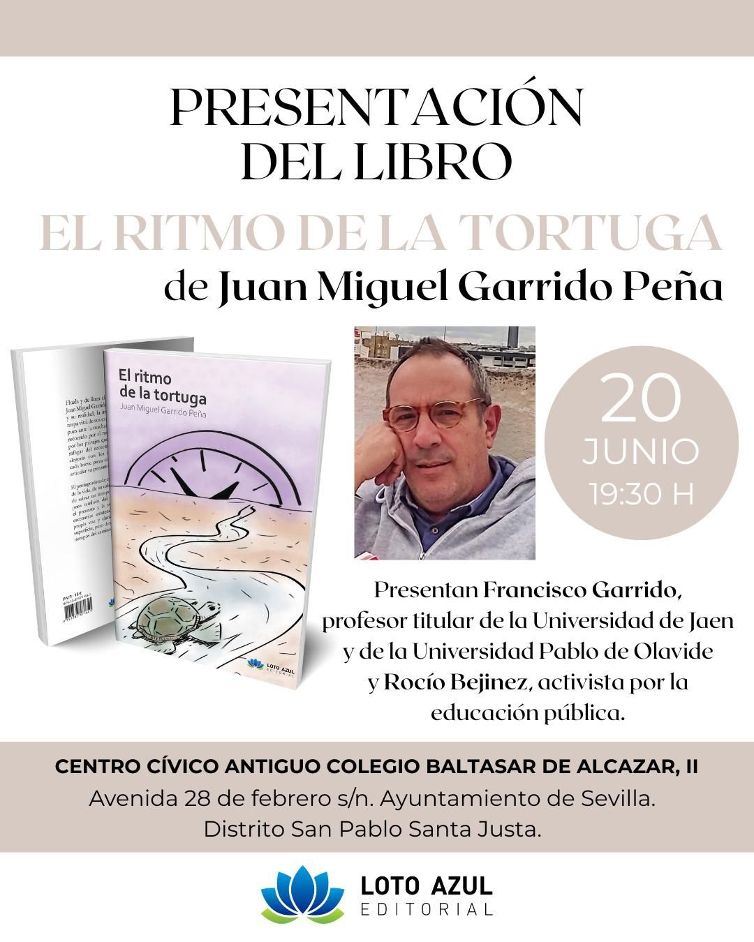 Aprovechamos la ocasión para promocionar la nueva creación de Juan Miguel Garrido, padre de una alumna del centro y miembro activo del AMPA y del Consejo Escolar, que presenta este viernes 20 de junio en el Centro Cívico de San Pablo (antiguo colegio Baltasar de Alcázar, Avda. 28 de febrero) del Ayto. de Sevilla su nuevo libro de poemas “El ritmo de la tortuga“, en el que su protagonista nos habla de la presencia de la vida, de su calor y desamparo, de la conciencia de salvar un tiempo y su declinación irremediable, pero también del sello de la reconciliación con el presente y la aventura de cada día.