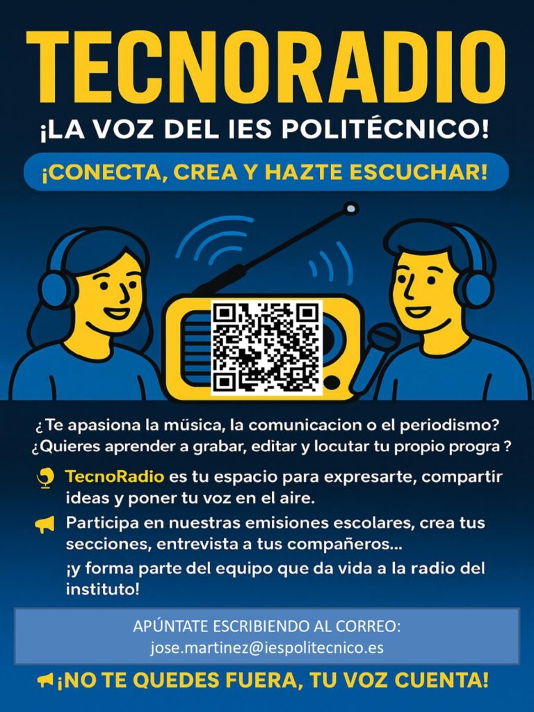 Vuelve TecnoRadio, la radio escolar del IES POLITÉCNICO ¿Sabes que nuestro instituto tiene su propia radio? ¿Que puedes hacer tus propios programas y podcasts? ¡¡De cualquier tema que te pueda interesar: música, videojuegos, literatura, ajedrez, anime… ¿Te apasiona la música, la comunicación o el periodismo? ¿Quieres aprender a grabar, editar y locutar tu propio programa? […]