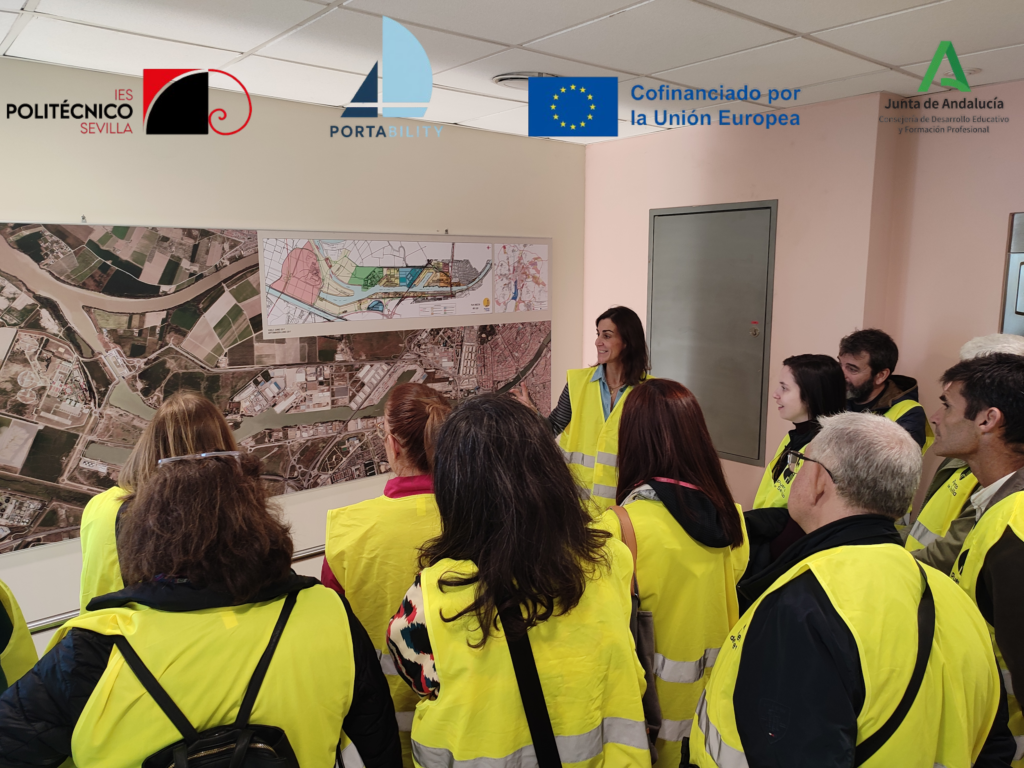 La visita congregó a un nutrido grupo de profesores y profesoras del IES Politécnico, 22 en total, acompañados por María Martínez, de la Cámara de Comercio de Sevilla, otro de los participantes en el proyecto PortAbility.