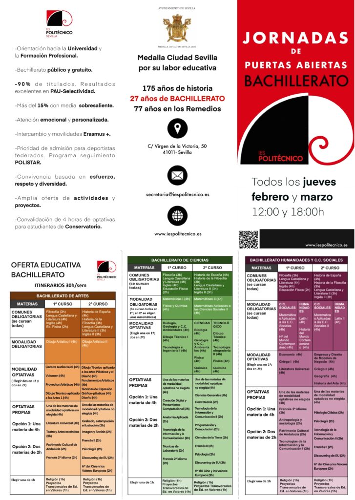 Jornadas de Puertas Abiertas Bachillerato. Jueves de febrero y marzo, 12h y 18h.