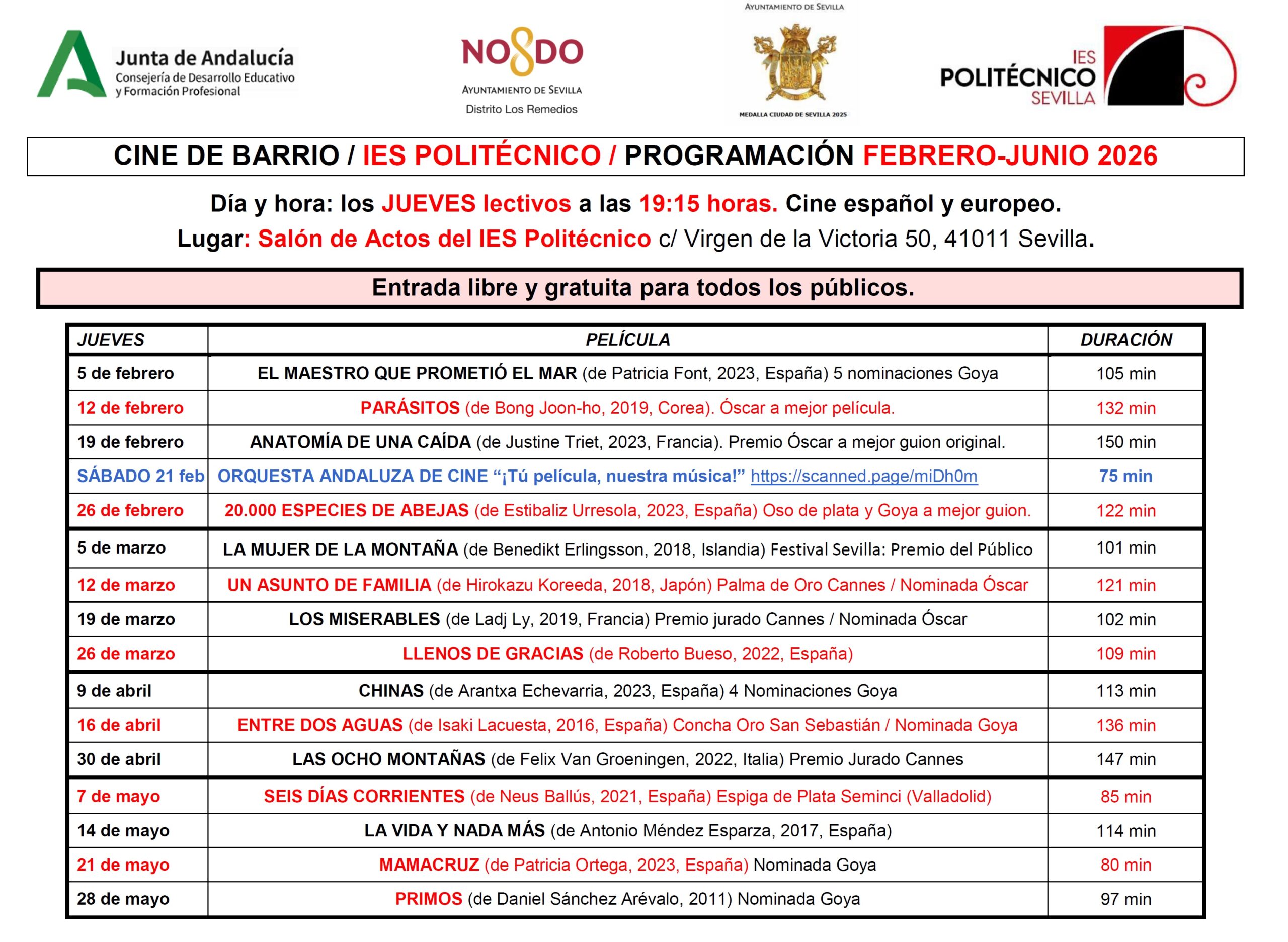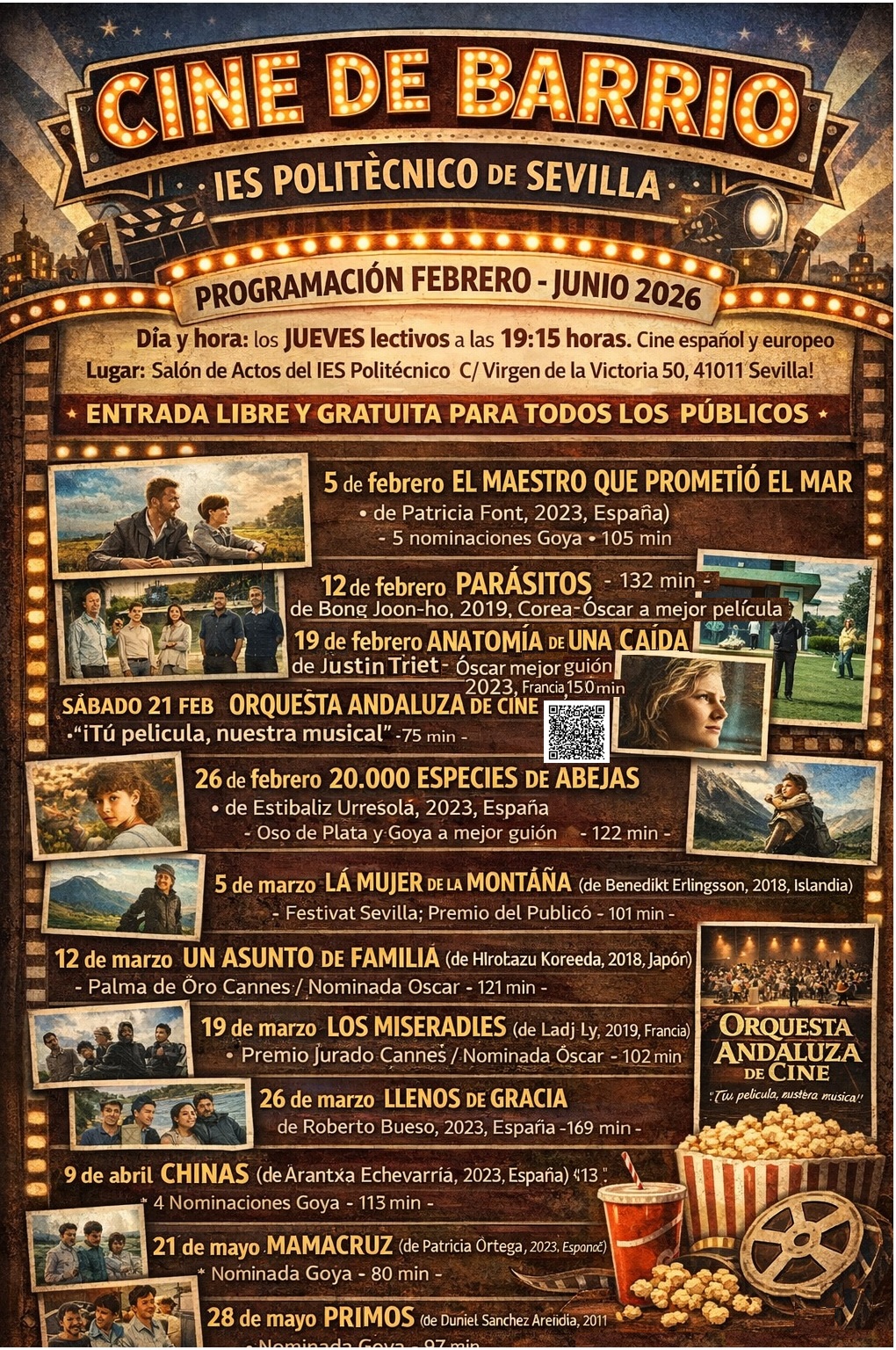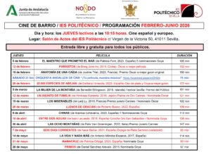 En febrero de 2023 estrenamos la primera temporada de “Cine de Barrio”. Se trata de una actividad más enmarcada dentro del programa de AulaDcine de la Consejería de Educación que se desarrolla en el IES Politécnico desde el 2021. De febrero a junio, cada jueves lectivo a las 19:15, se lleva a cabo en el Salón de Actos la proyección abierta y gratuita para todos los públicos de películas, preferentemente, andaluzas, españolas y europeas, por este orden. Su comienzo contó con la proyección de un ciclo de películas con premios Goya coincidiendo con la celebración del evento de la Academia de las Artes y las Ciencias Cinematográficas de España el 12 de febrero de 2023 en Sevilla.