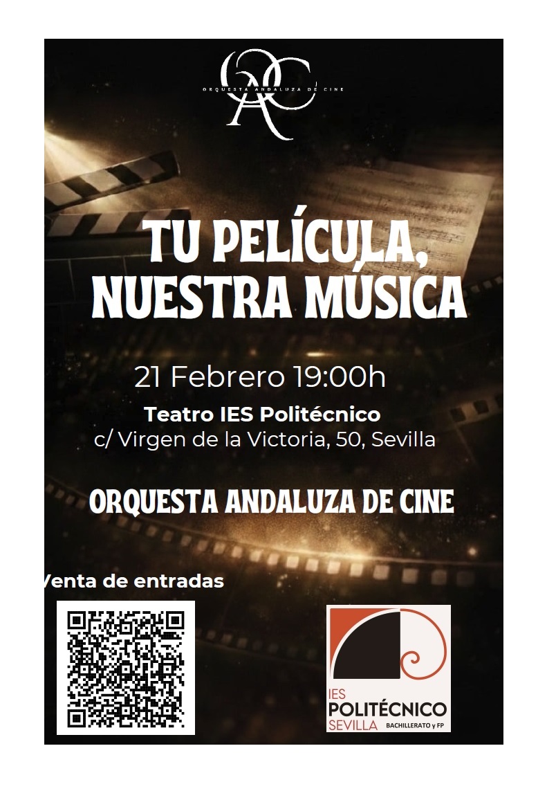 Como atractiva novedad, el sábado 21 de febrero a las 19h la recién creada ORQUESTA ANDALUZA DE CINE hará su presentación en el IES Politécnico interpretando grandes clásicos del cine mediante el programa “¡Tú película, nuestra música!”. Entradas disponibles en este enlace